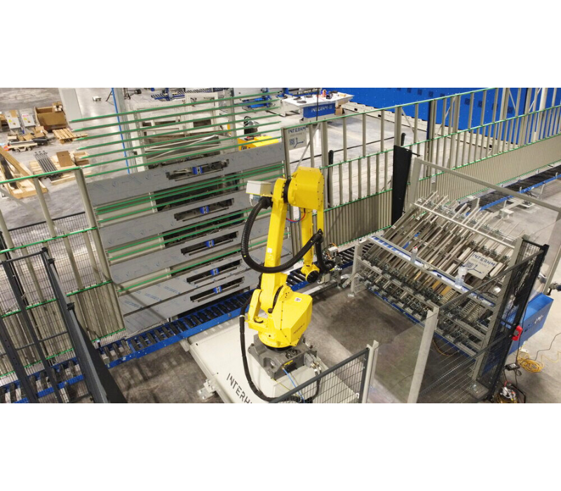 Für die verschiedenen Beschlagtypen ist ein Magazin enthalten, das von hinten nachgefüllt werden kann, ohne das System anzuhalten. Sobald alle Beschläge montiert sind, wird der fertige Rahmen auf einen automatischen vertikalen Rollenförderer übertragen.