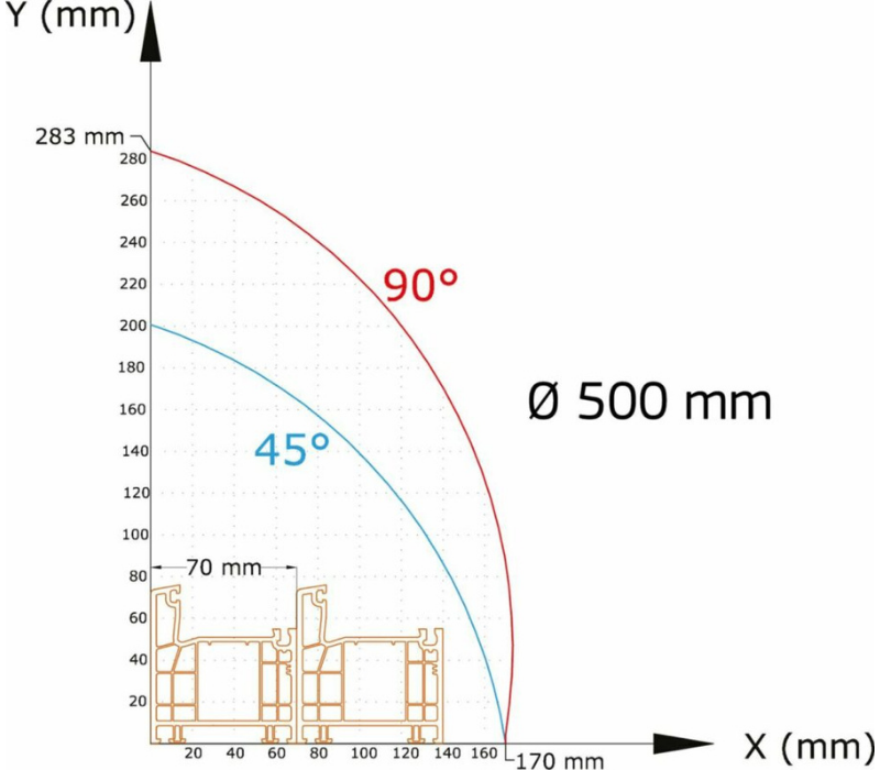 The maximum cutting length is 4,000 mm without repositioning the profile. Longer profile pieces can be cut by automatically repositioning the profile. The minimum cutting length with both heads at 90° is 500 mm. An automatically retractable stop is provided for cutting shorter lengths.