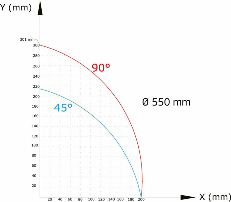 The maximum cutting length is 5,000 mm without repositioning the profile. Longer profile pieces can be cut by automatically repositioning the profile. The minimum cutting length with both heads at 90° is 550 mm. An automatically retractable stop is provided for cutting shorter lengths.