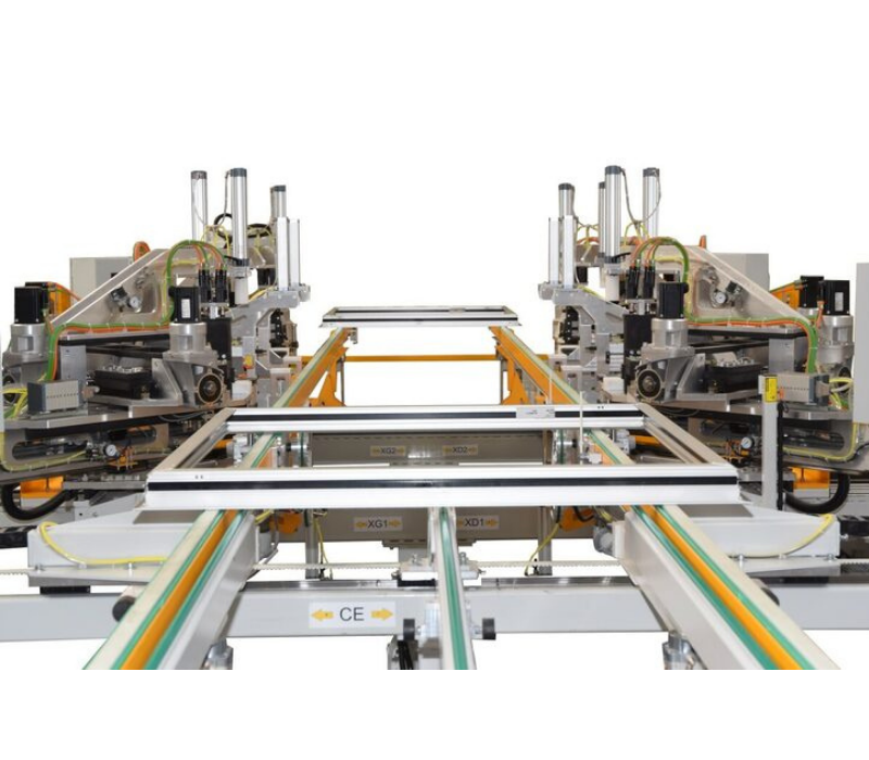 The 4-head corner crimping press can be combined with a gasket insertion machine and/or an automatic buffer and sorting system for crimped elements. After corner cleaning, the element is automatically conveyed to the next machine.