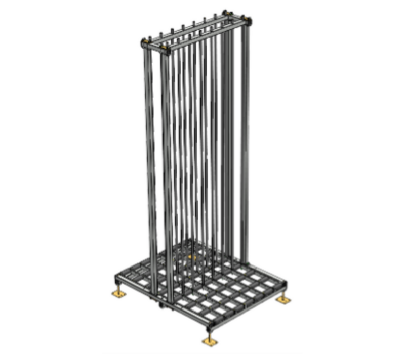 Buffer rack suitable for vertical storage of elements. The buffer rack has 7 compartments with a compartment width of 140 mm and a compartment height of 2.800 mm. The total dimensions are 1.250 x 1.500 x 3.300 mm. The compartments are divided using rods with rubber protection.