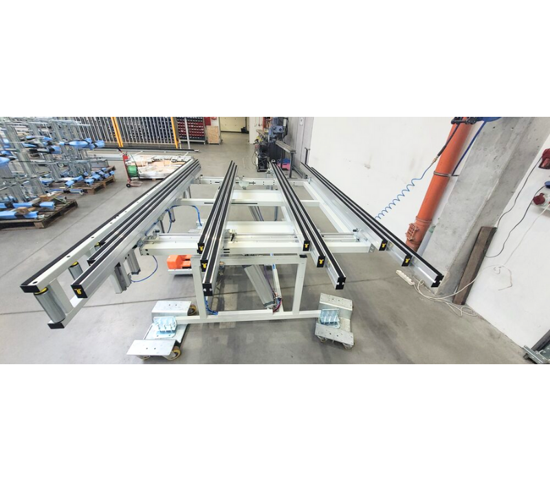 The base dimensions of the work platform are 3.000 x 1.800 mm. The work platform consists of 4 support beams, which are extendable from 3.000 to 5.000 mm. The positions of the support beams are manually adjustable. The top support beam is adjustable from 1.800 to 2.700 mm. The working height is fixed and adjustable between 900 and 1.000 mm. Thanks to the open structure of the work platform, all four sides of the element being assembled are easily accessible. The surface of the work platform is standardly covered with rubber, brushes, or sliding strips. Felt can be optionally added. The maximum load capacity is 400 kg. The work platform can be pneumatically tilted from a horizontal to a vertical position using a foot pedal. A clamping cylinder is provided to secure the element during tilting. The roller conveyor is pneumatically foldable and comes with rollers 200 mm in length. The standard color is RAL 7035.