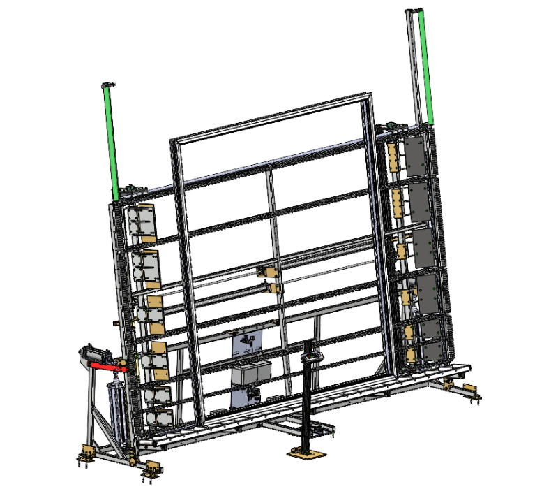 The element is clamped in the center of the roller conveyor using 2 clamping bars. The clamping bars position themselves simultaneously and synchronously from the outside toward the center to secure the element. The clamping bars are operated via a foot pedal. Optionally, the assembly station can be equipped with a pneumatic tilting system for the roller conveyor, adjustable from 83° to 90°. The clamping bars can be pneumatically folded away behind the support surface of the roller conveyor, allowing elements to be transferred to and from the next station.
