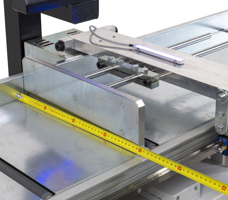 The TM-DIGISTOP-H is an electronic length stop with a maximum load capacity of 20 kg/m. The length stop is available in 4 models depending on the maximum positioning length: 3,000, 4,000, 5,000, and 6,000 mm. For handling heavy profiles, the stop is equipped with a sliding table with integrated rollers. The positioning of the stop has a repeatability of +/- 0.1 mm thanks to the magnetic tape, ensuring absolute precision and high positioning speed. A cut list can be created by manually entering data via the PC touch screen, loading files via Ethernet, Wi-Fi, or USB stick, or wirelessly transmitting cut lengths using the wireless measuring rod. The length stop can be mounted on either the left or right side of the machine.