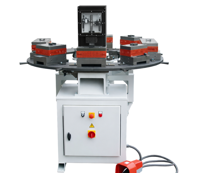 The punching machine can be equipped with a roller conveyor or length stop. Optionally, the machine can be upgraded with a rotary table capable of holding up to 6 punching tools. Optional versions are available with an analog or digital depth stop.